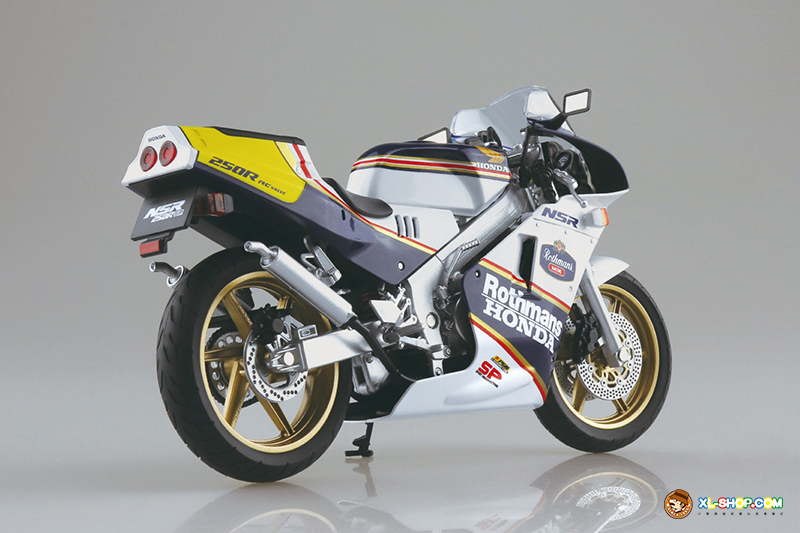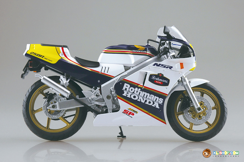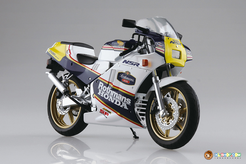 The characteristic silhouette of the NSR250R, including the distinctive cowl, frame shape, and color pattern, is fully replicated in this model.