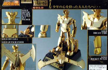 Die-cast Soul of Chogokin GX-01RG GOLD MAZINGER Z. It comes with Scramble Dash, Drill Pressure Punch, Brain Condor,Great Booster, Sword and a display stand to place all these items. It is a must-collect for Chogokin and MAZINGER fans !