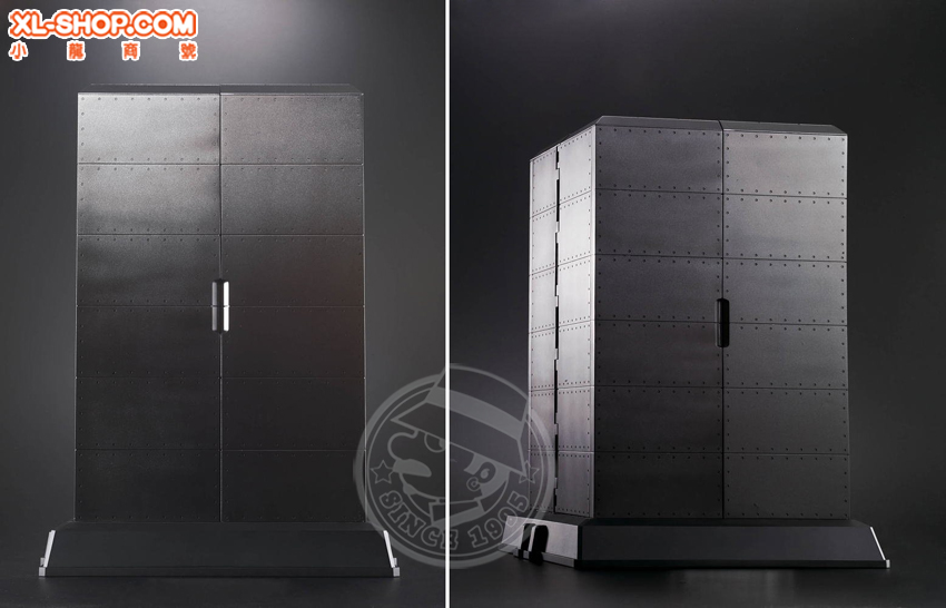 The included hangar-base can be used to display the figurine and its armor. The moveable LED lights on the platform illuminate the figurine from below for dramatic effect.