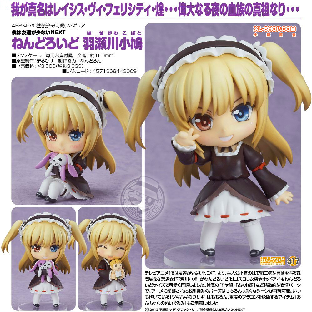 Her cute goth-loli outfit has been shrunk down, and her different colored eyes look just as cute in Nendoroid form! A special expression and other optional parts are included allowing you to pose her as the anime character she often pretends to be. She also comes with the patched-up bunny plushie she always holds onto, along with the 'An-chan Plushie' which shows just how severe her brother complex is!