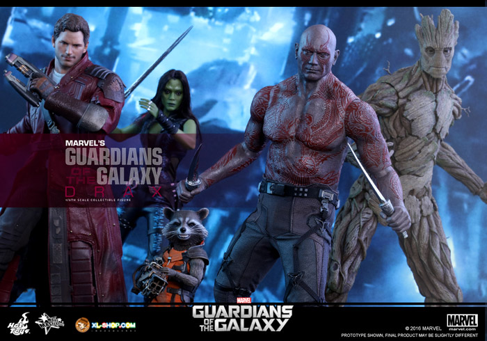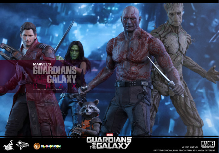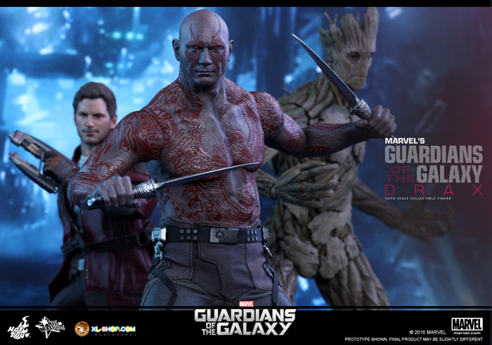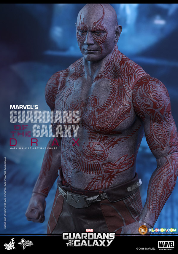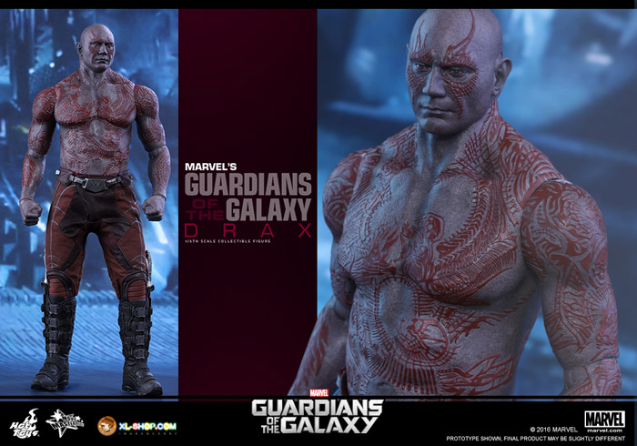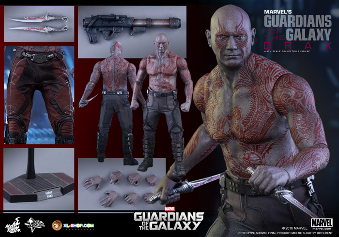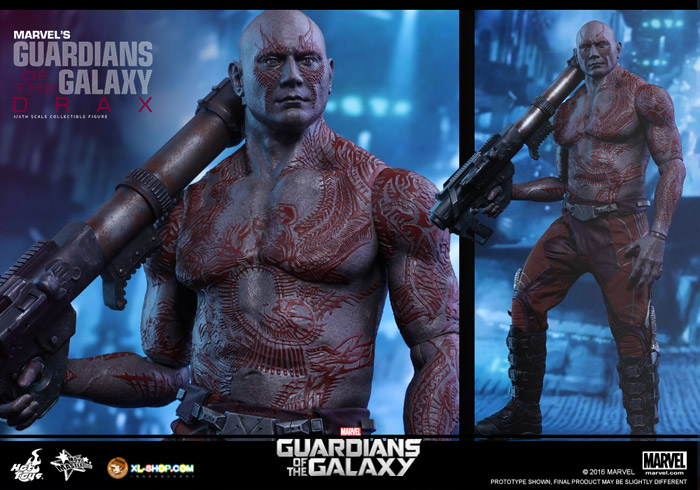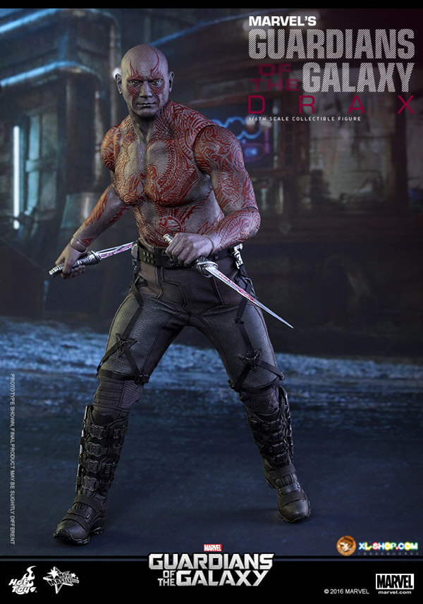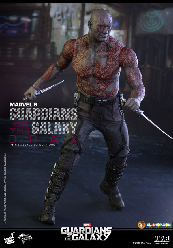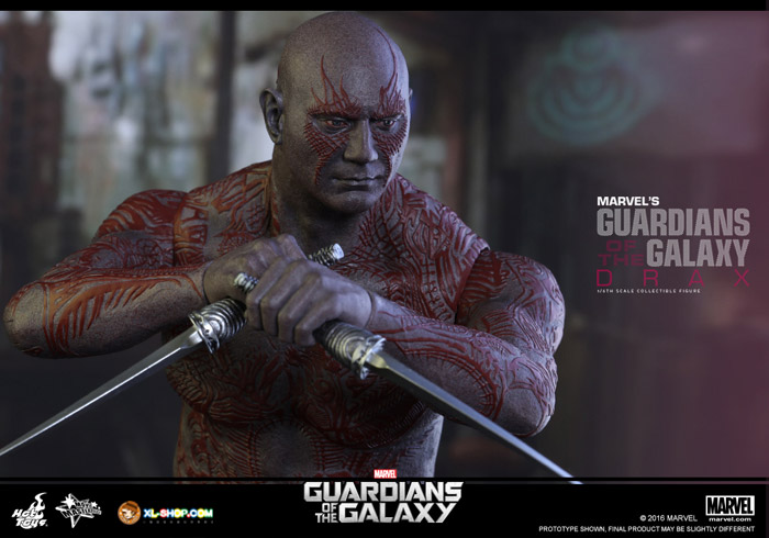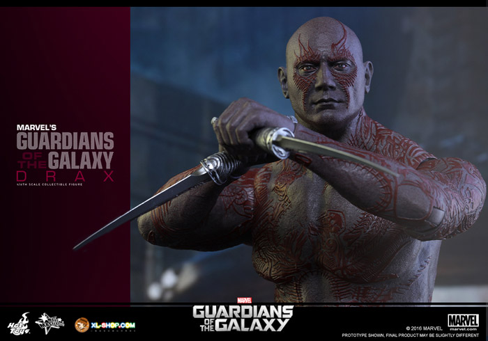 The movie-accurate Drax the Destroyer collectible figure is specially crafted based on the image of Dave Bautista in the movie, featuring the newly developed head sculpt, a newly developed muscular body with detailed sculpture of the character's iconic tattoos, two styles of interchangeable pants, two blades, a rocket launcher, and a Guardians of the Galaxy themed figure stand.
