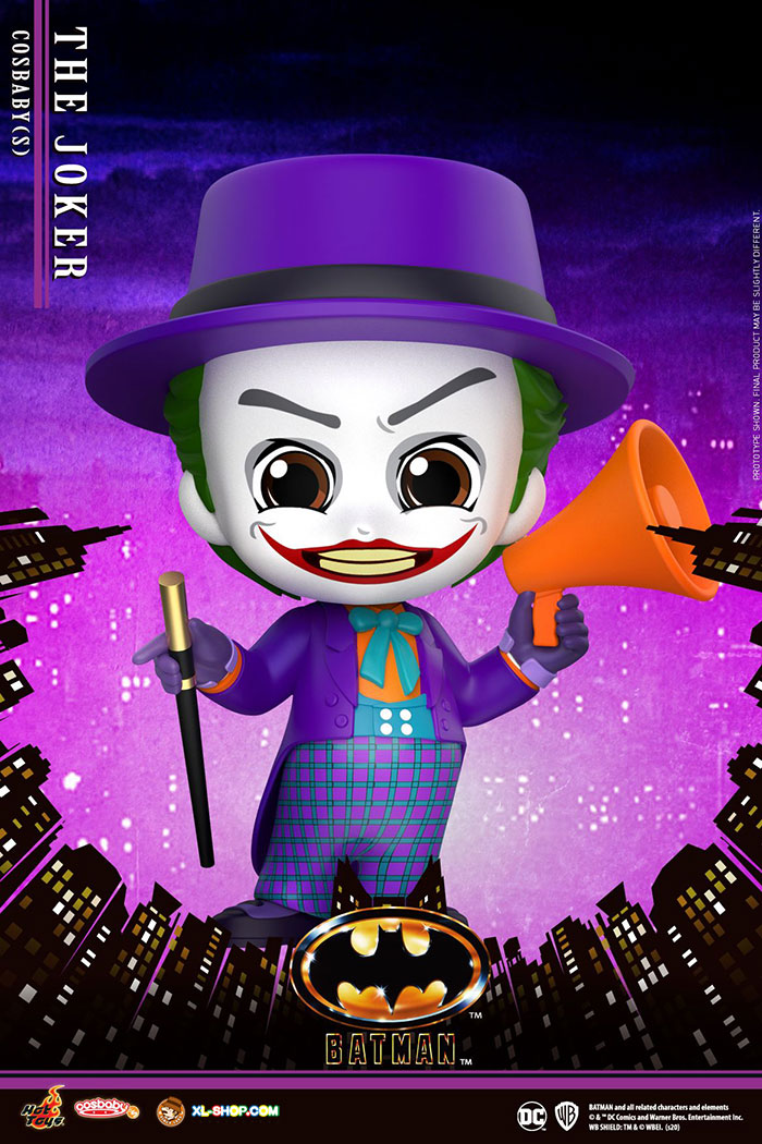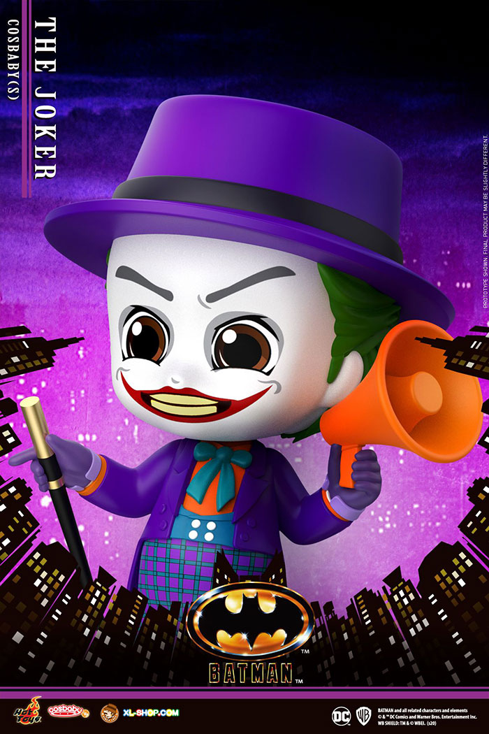 When the Bat-Signal flashes across the night sky, Batman springs into action and descends from the rooftops to defend the citizens of Gotham City from the criminal underworld that threatens them. Based on the classic Batman released in 1989,Hot Toys is thrilled to present its Cosbaby collectibles of Batman and The Joker to recall moments from movie! Features Batman with Batmobile Cosbaby (S) Collectible Set; Batman with Grappling Gun, Joker, Joker (Laughing Version), and Joker (Mime Version) Cosbaby (S).Each Cosbaby stands approximately 11.5 - 12cm tall with rotatable head and themed figure base.