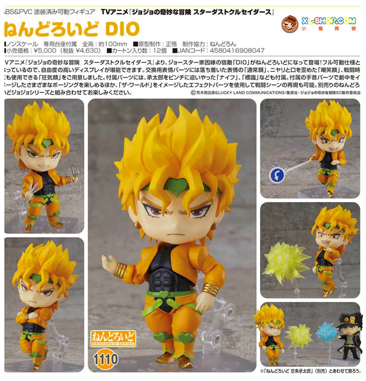 From the anime series "JoJo's Bizarre Adventure: Stardust Crusaders" comes a Nendoroid of the longtime enemy of the Joestar family, DIO! The figure is fully articulated so you can display him in a wide variety of poses. He comes with three face plates including his standard expression, his sneering expression and his crazed expression.