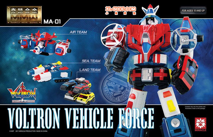 Founded in 2006, Miracle Productions quickly established themselves as the premier robot toy and collectable designer in Hong Kong. Their much heralded Gaiking the Legend of Daiku Maryu line as well as their follow up-Project Super Robot series were both innovative and high quality. This new Vehicle Voltron ultimate combining chogokin is a culmination of their team's many years of design experience, as well as a genuine passion for this iconic robot. In development for almost two years, this is sure to be the absolute finest Voltron collectable toy ever released! Vehicle Voltron consisted of fifteen members, who were divided into three teams of five, known respectively as the Land, Sea, and Air Teams. Each team was specialized in gathering data or fighting in their area of expertise. Each team could also combine their vehicles into a bigger machine, with each combined vehicle differing amongst the three teams. These fighters were: The Aqua Fighter (Sea Team) The Turbo Terrain Fighter (Land Team) The Strato Fighter (Air Team) When necessary, all fifteen vehicles combine to form the mighty Voltron. This Voltron in the toy line was referred to as Voltron I as it was set closest to Earth. This amazing new Voltron stands nearly thirteen inches tall, contains over fifty percent die-cast and is fully articulated. All fifteen individual vehicles can be combined to form all three team machines as well as this GIANT super robot. Includes Voltron's signature spinning laser blades, solar combat spears, two sets of alternate hands and of course-the blazing sword. This one of a kind collectable comes beautifully packaged in a collector's box with slip cover and foam storage tray.