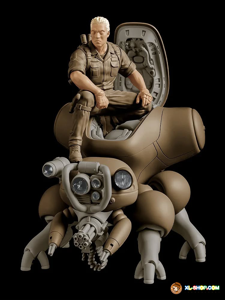 The kit includes Batou in a fixed pose sitting atop Fuchikoma and a Gatling gun equipped to its head. The olive green plastic gives the models a military feel.