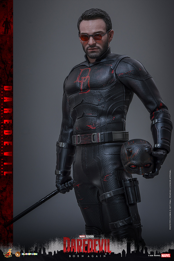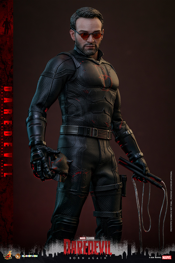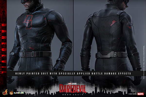 • One (1) newly painted black colored Daredevil suit featuring a red DD logo on the chest, with weathering effects that reveal the original red color beneath the worn black paint