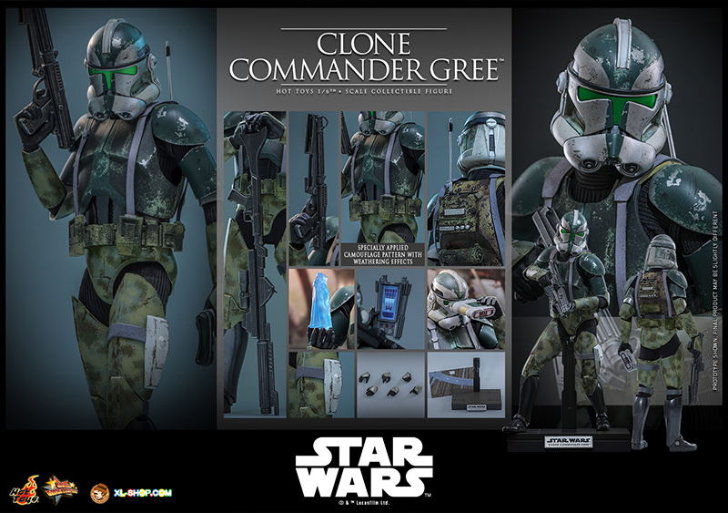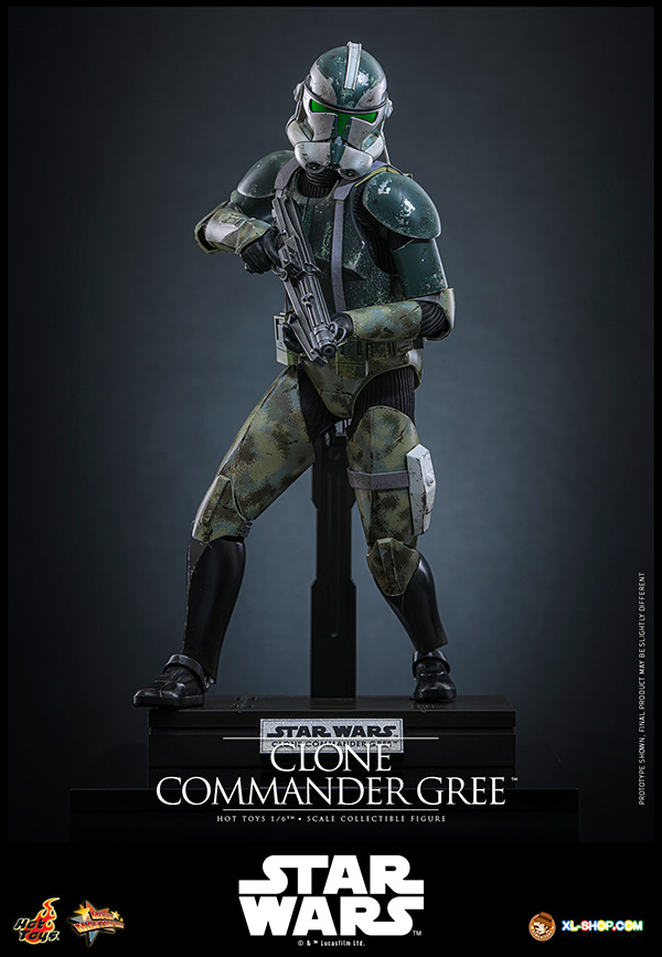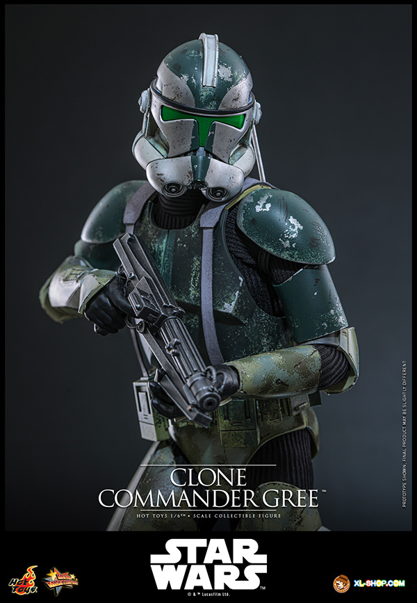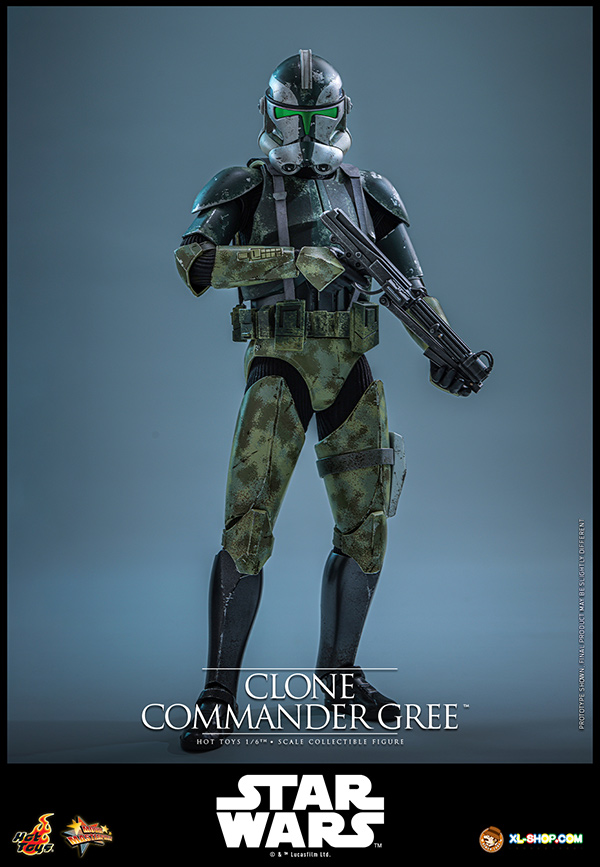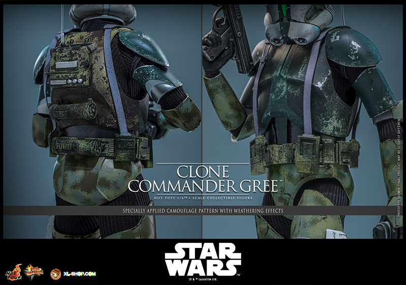 • One (1) set of finely crafted multi-green camouflage colored Clone Commander Gree armor with two harnesses and weathering effects