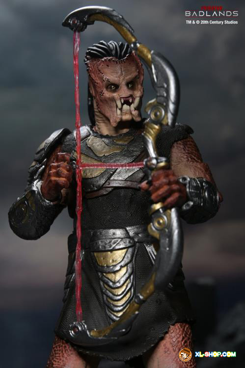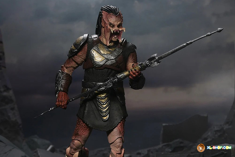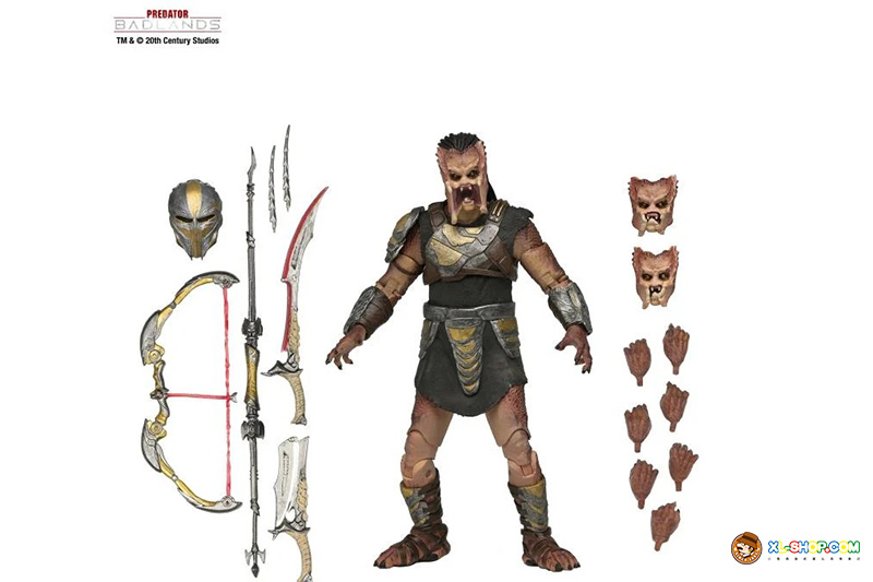 This fully articulated figure includes interchangeable faceplates and hands, extended combistick, gauntlet blades, collapsed and extended Yautja swords, and extended Yautja compound bow.