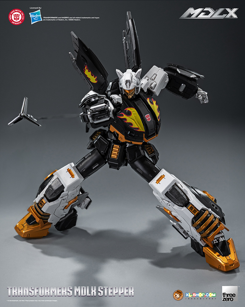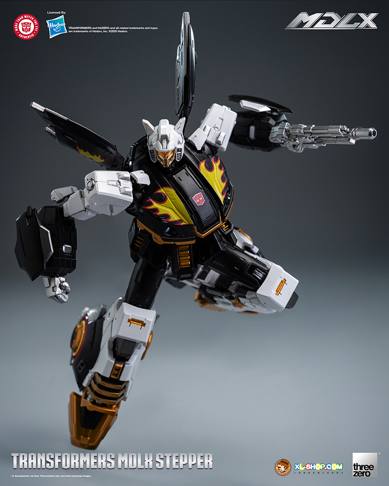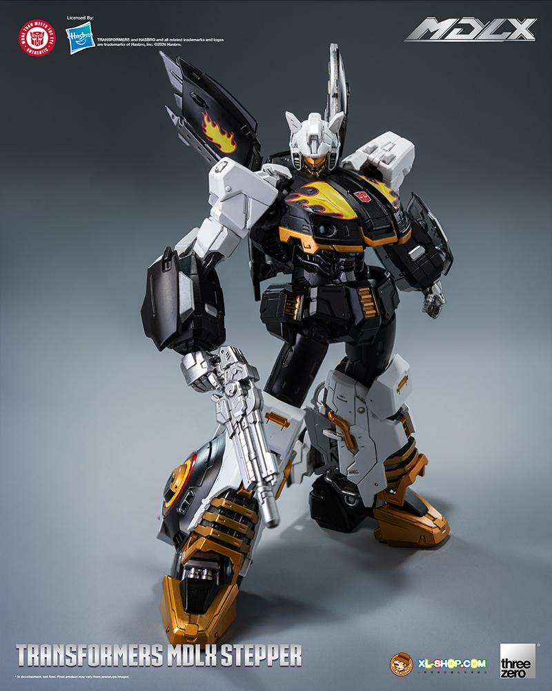 MDLX Stepper features a black, white, and gold color scheme combined with the character’s G1‑inspired deco delivering a striking, layered visual effect: deeper hues sharpen sculpted lines, refined paintwork emphasizes the metallic detailings, and the flame motif on the chest serves as a visual focal point that boosts the figure’s recognizability.
