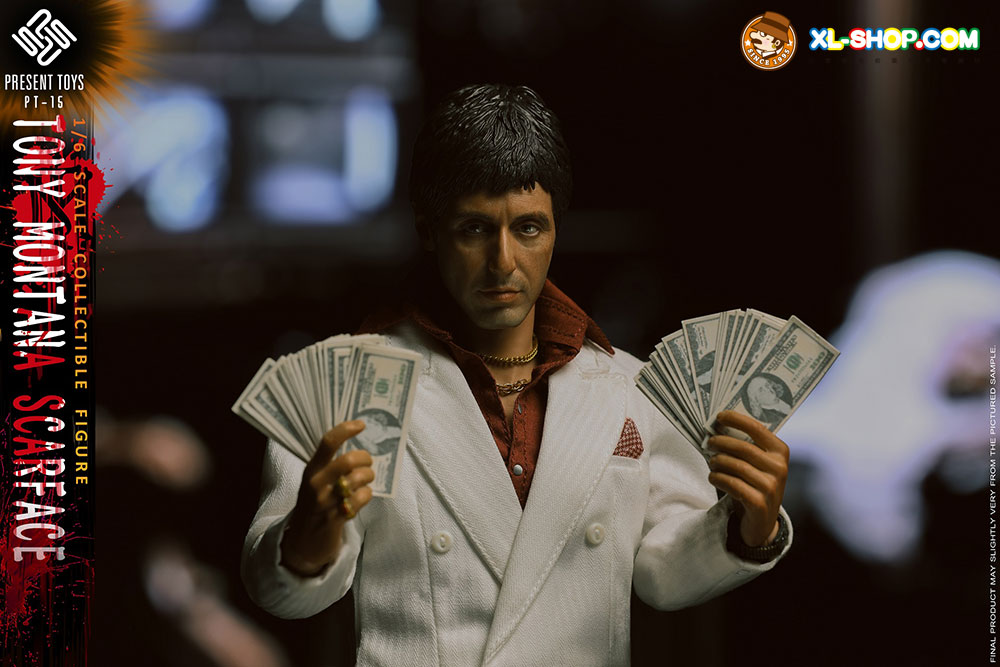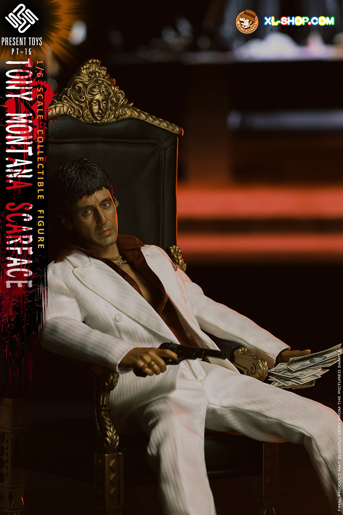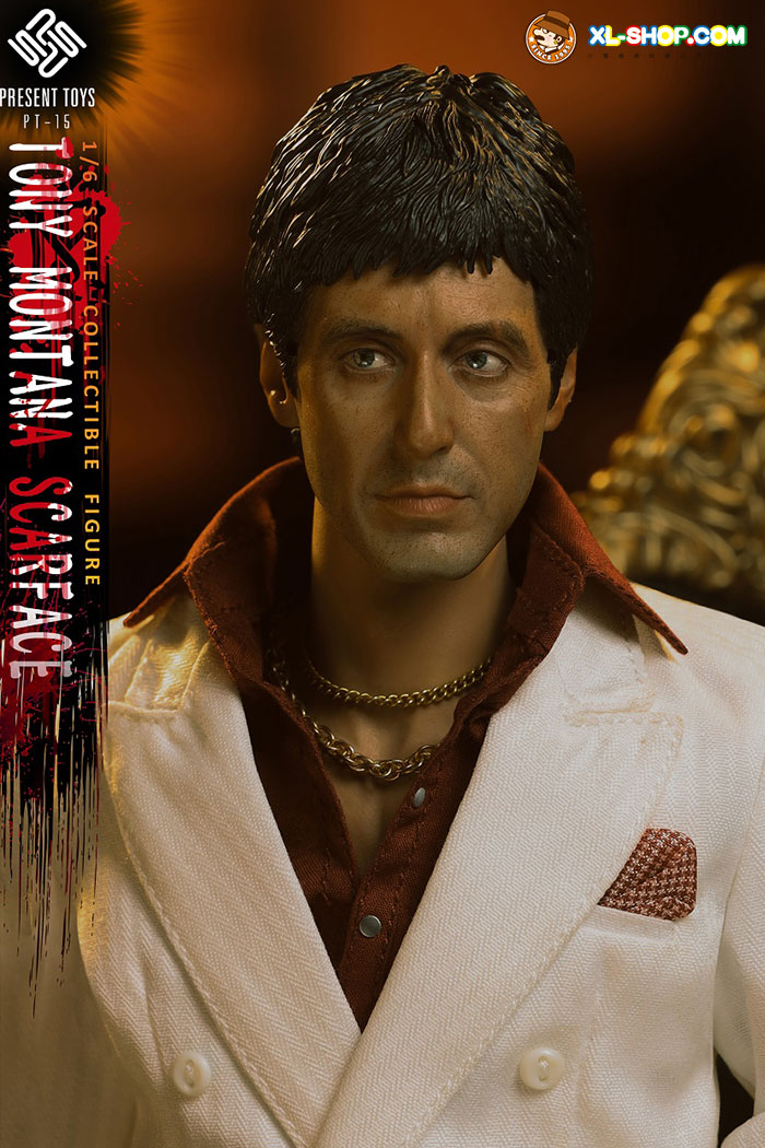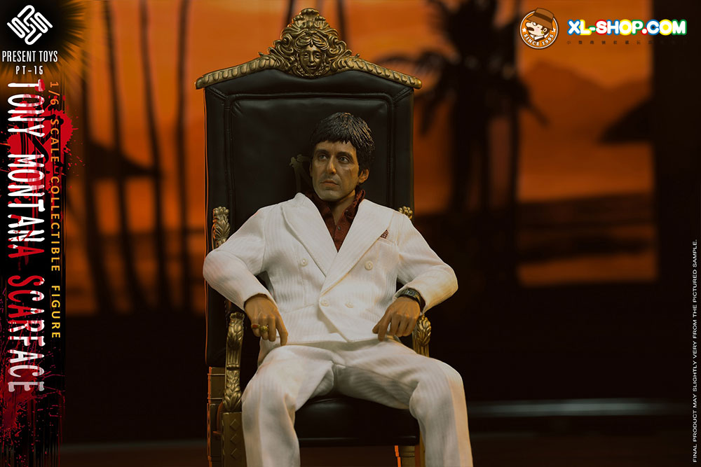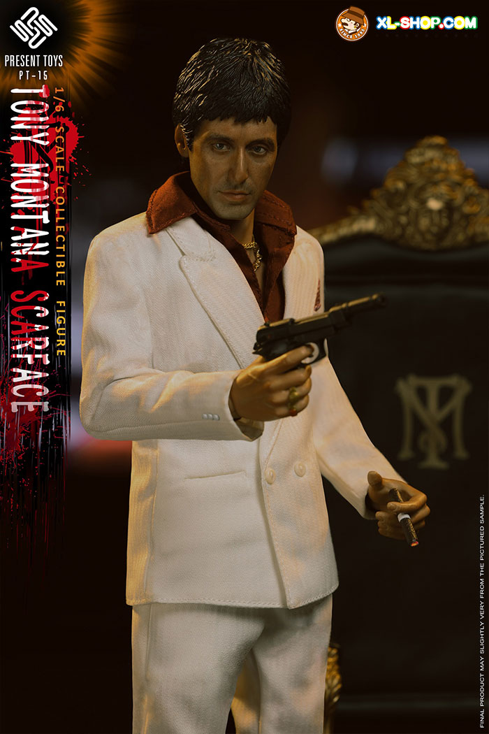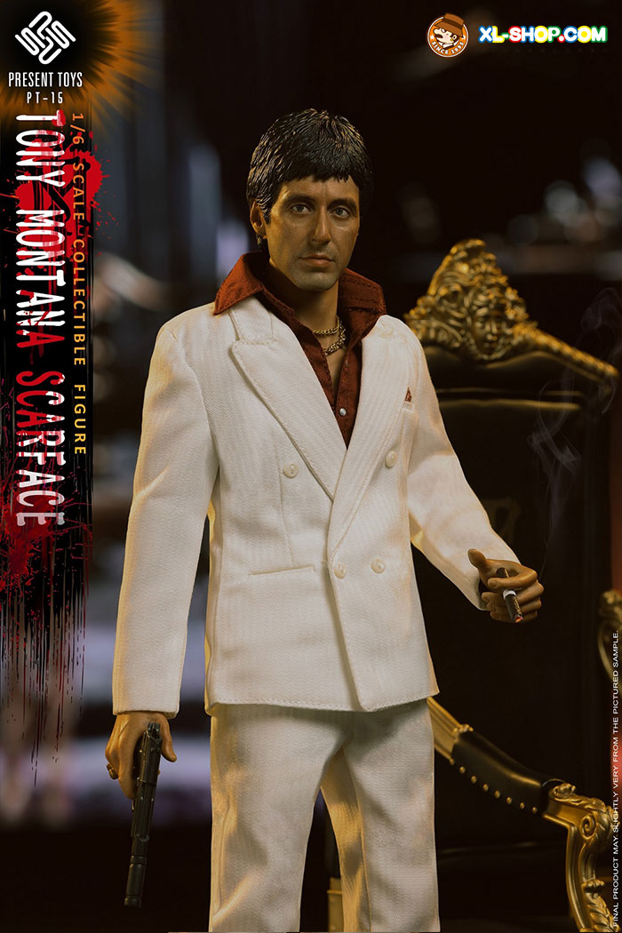 PRESENT TOYS - PT-SP15 - 1/6 Scarface List: Authentic Head Sculpture x1 Articulated Body x1 Interchangeable Hands x6 Cigar x1 Pistol x1(Blade Runner 2049 Blaster) Pistol Silencer x1 Chair x1 Thermal Device x1 Watch x1 Cash x20 Necklace x2 Figure Stand x1 Clothes: White Suit x1 Red Shirt x1 White Pants x1 Shoes x1