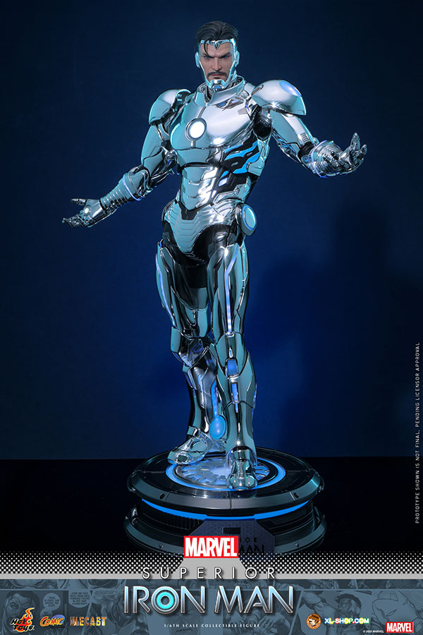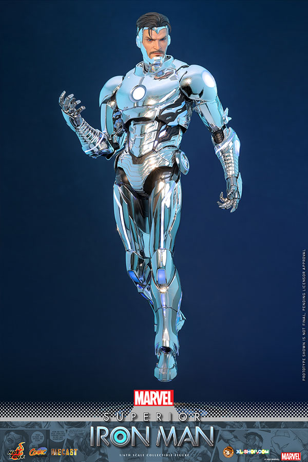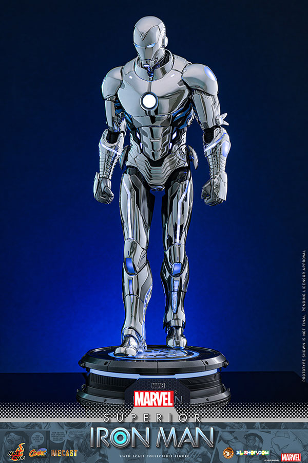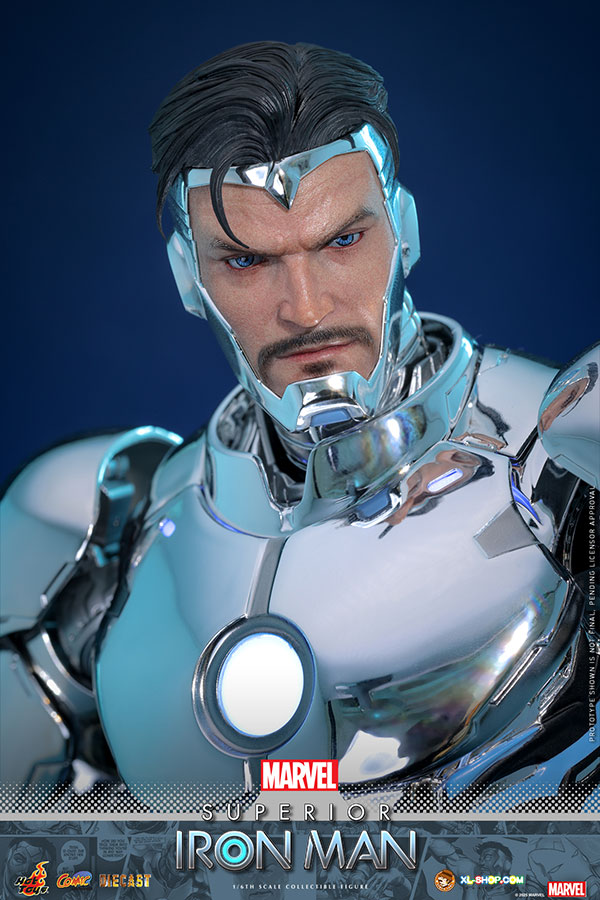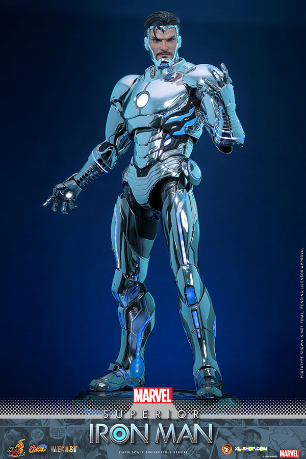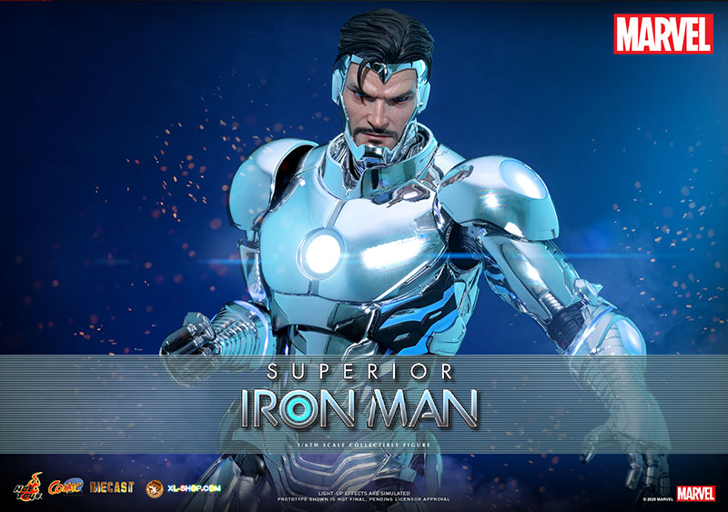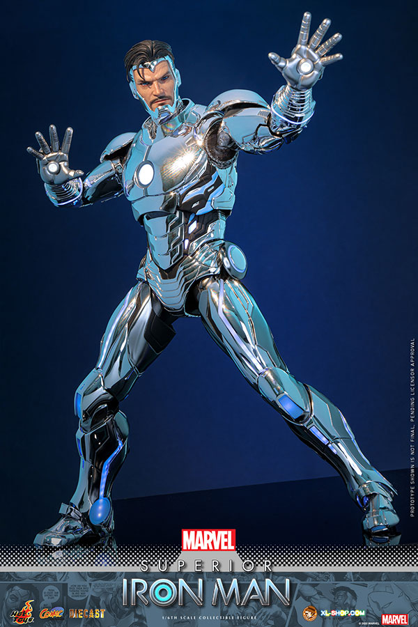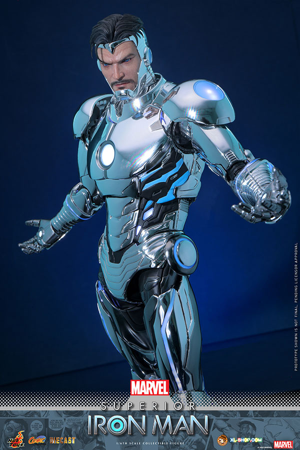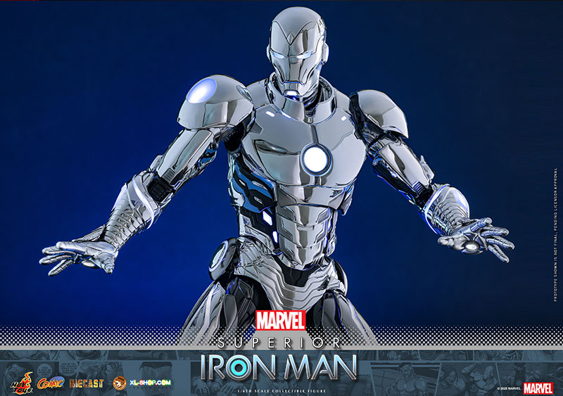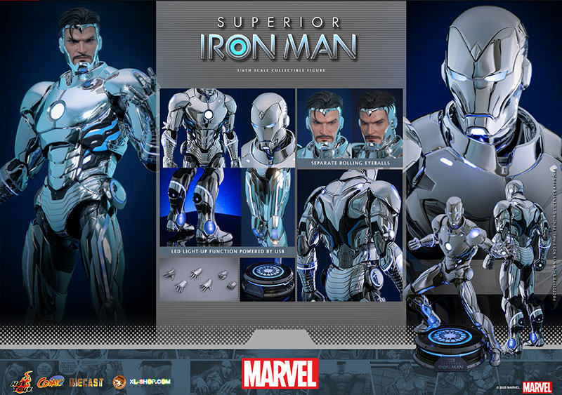 Hot Toys is thrilled to announce the 1/6th scale Superior Iron Man Collectible Figure. Crafted with premium die-cast materials, the armor is coated in gleaming metallic silver with an electroplating finish. The removable chest armor reveals intricate internal mechanics, offering a visual glimpse into the mechanized wonders beneath. This figure features full-body LED lighting powered via a single USB-C port, casting an imposing blue glow when fully activated. Luminous points include arms, palms, legs, abdomen, circle-shaped Arc Reactor on chest, and more. The set includes six interchangeable hands to recreate combat and heroic poses. Completing the display is a specially designed metallic silver figure stand with LED light-up base, casting a reflective glow across the armor. A Special Edition only available in selected markets will include a specially designed Superior Iron Man metal collectible card with display case.