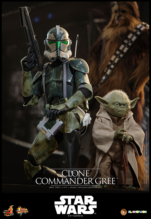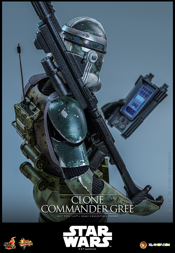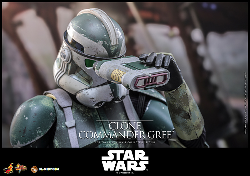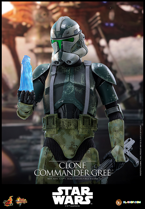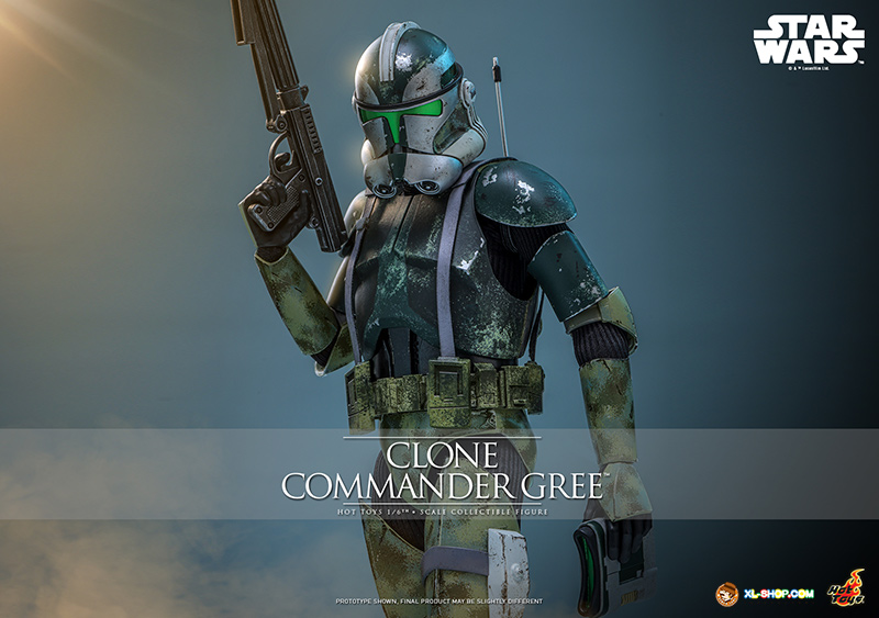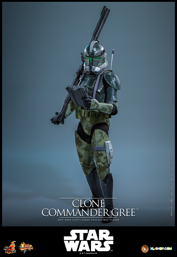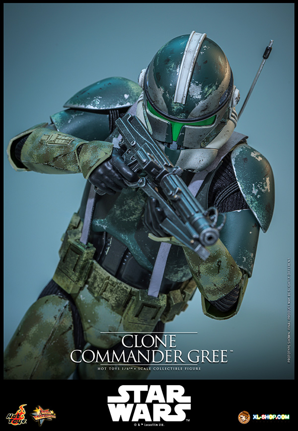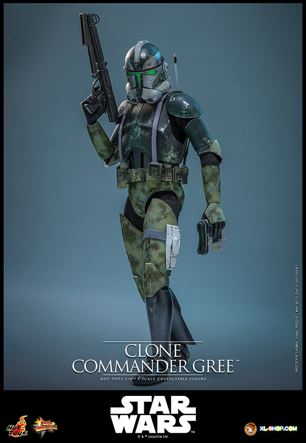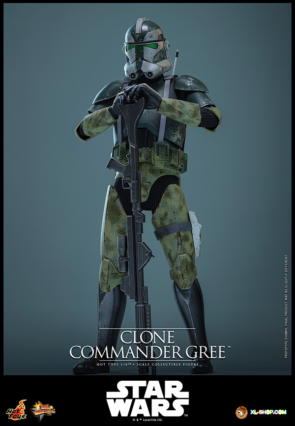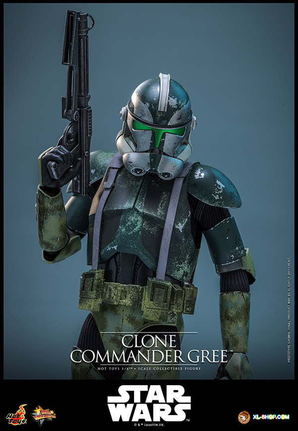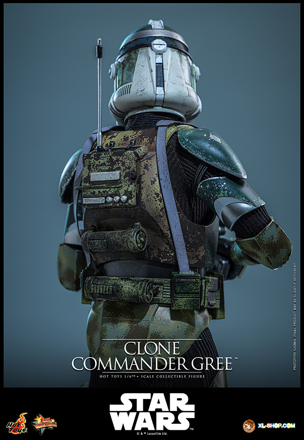 • One (1) set of finely crafted multi-green camouflage colored Clone Commander Gree armor with two harnesses and weathering effects