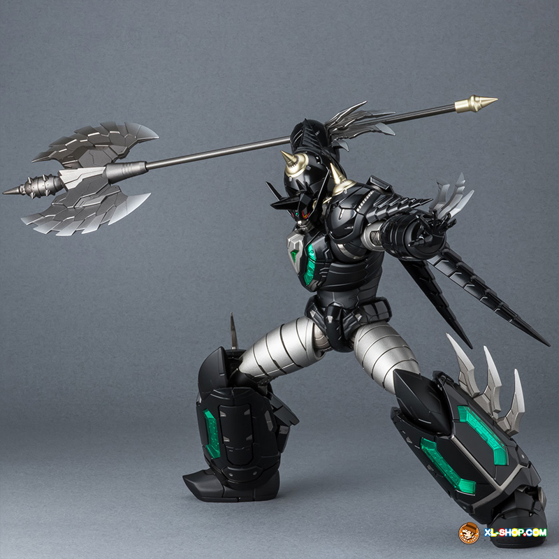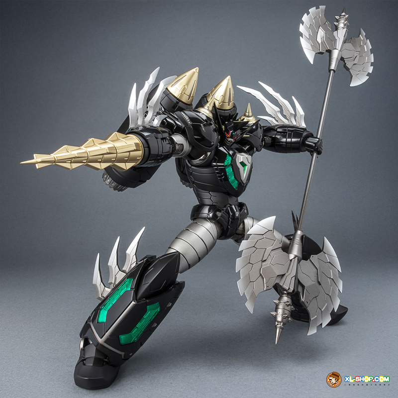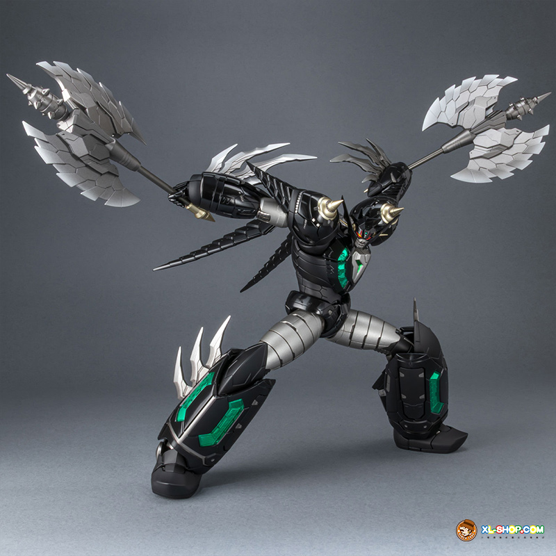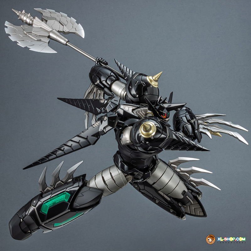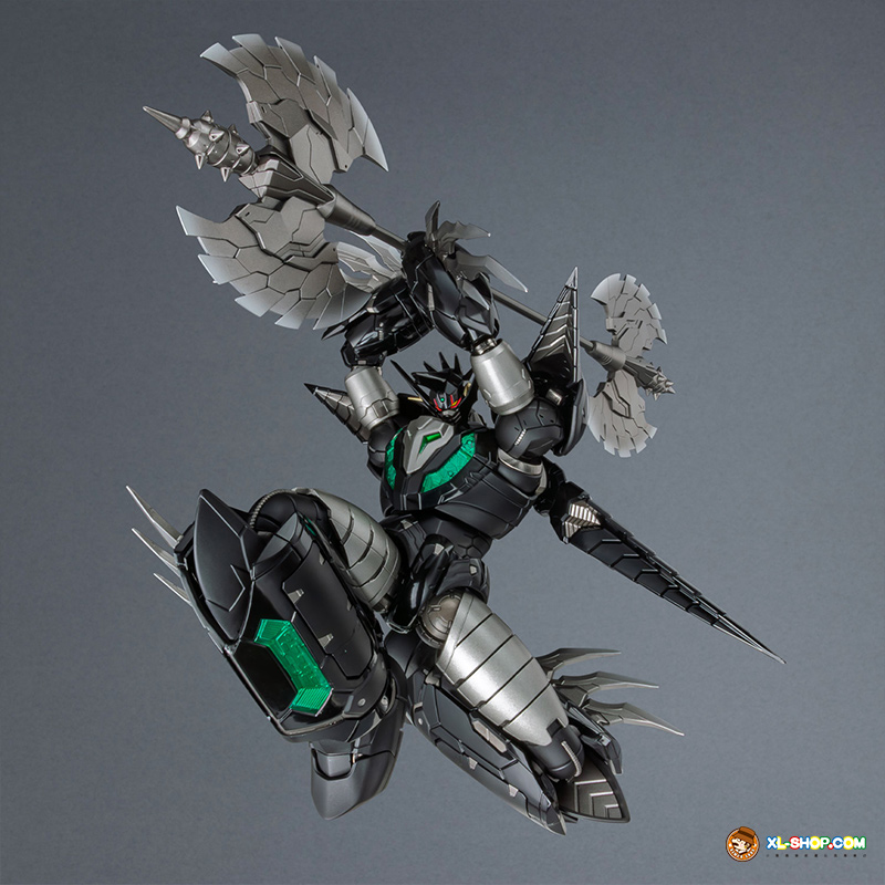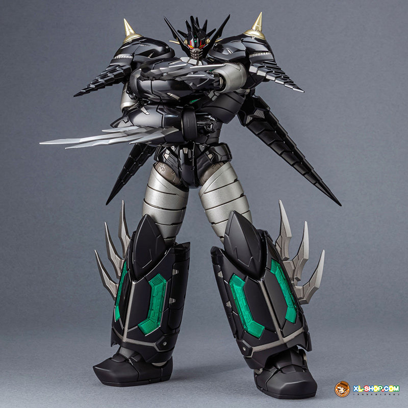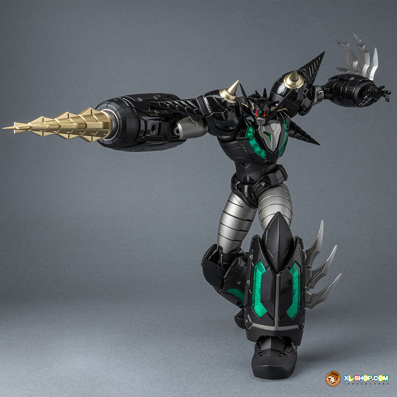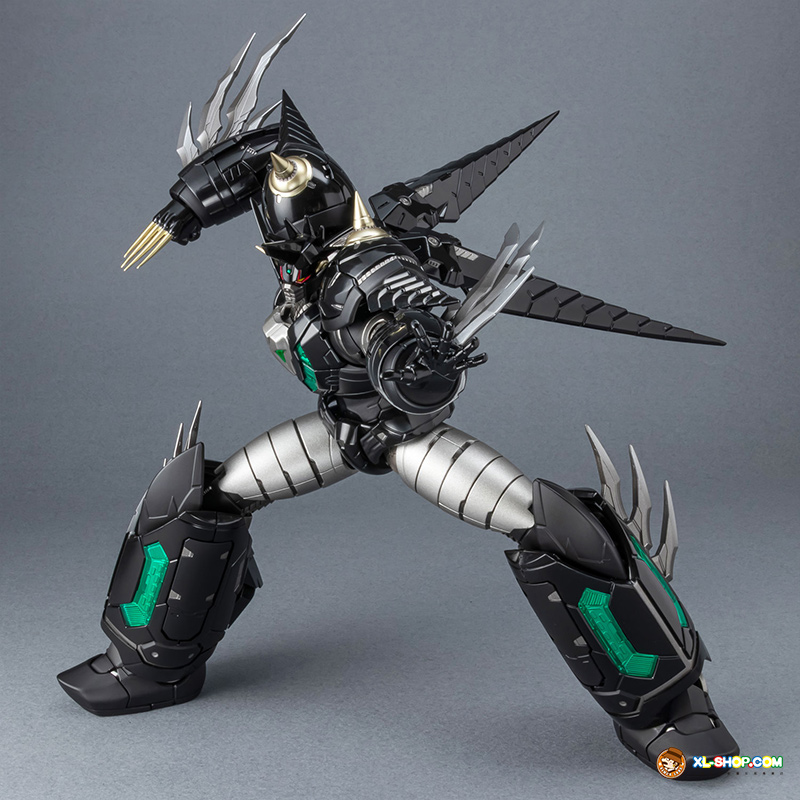 The all-black coloring is reproduced with both matte and glossy paint; the face parts are newly sculpted, and fist parts equipped with sharp spikes are included. Clear parts are used in various places to recreate the internal mecha mold and Getter Rays. The alloy material gives this figure an impressive weight!
