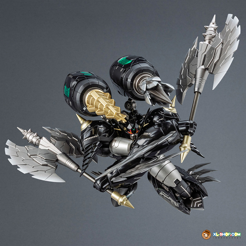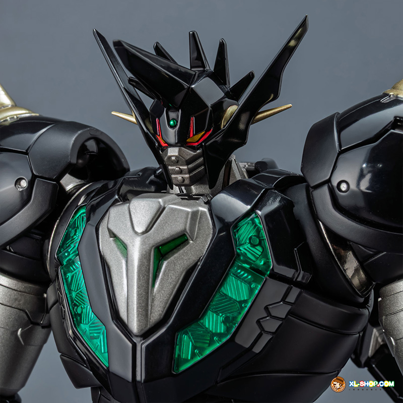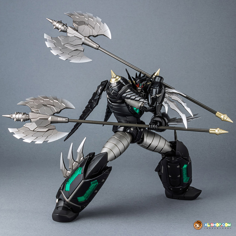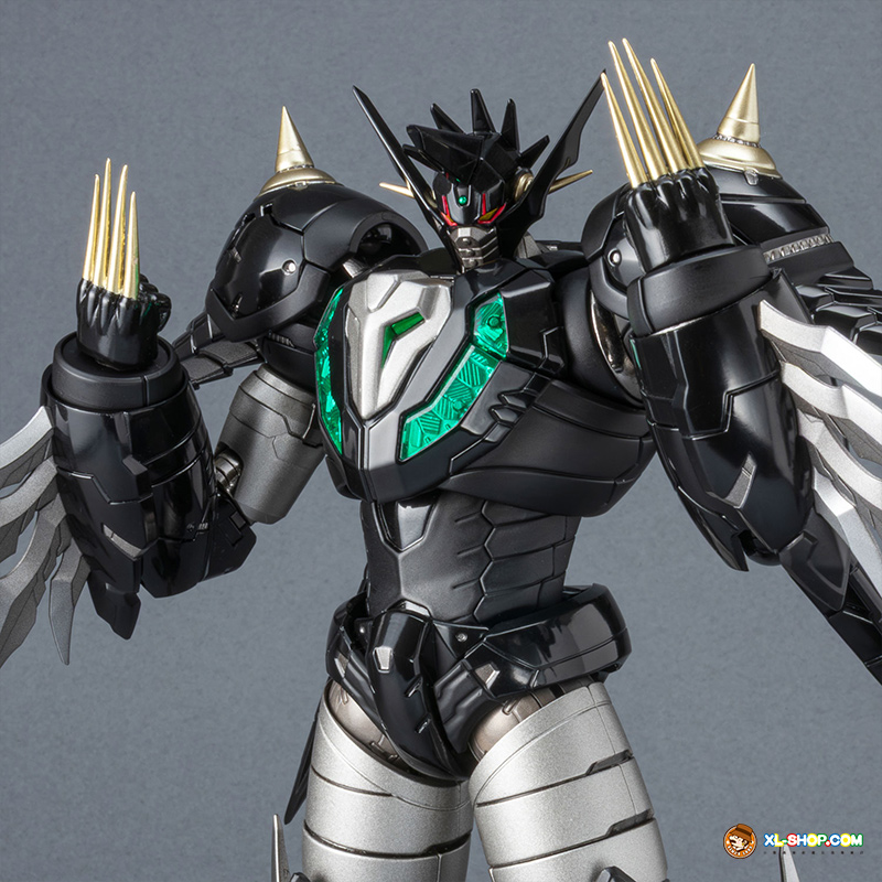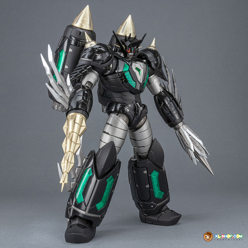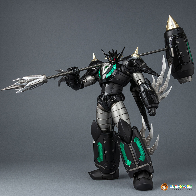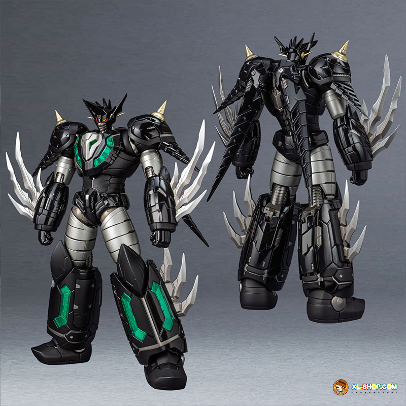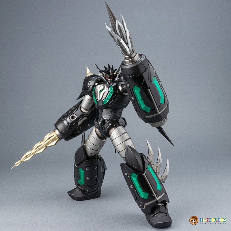 The all-black coloring is reproduced with both matte and glossy paint; the face parts are newly sculpted, and fist parts equipped with sharp spikes are included. Clear parts are used in various places to recreate the internal mecha mold and Getter Rays. The alloy material gives this figure an impressive weight!